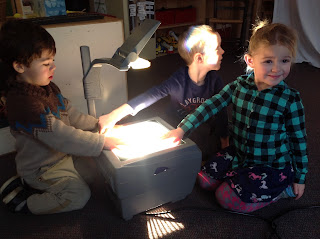 This week we began our study of Light/Dark Color and Shadows. There were many different kinds of activities that allowed the children to experiment and explore with the properties of light and dark, color and shadows. In the Block Area, there was a projector casting light on a large white sheet. Children danced in front of the light casting shadows. Children put a variety of objects on the projector, casting shapes and colors. One of the tables was covered in finger paint with a sheet of cellophane on top. This allowed the children to blend colors and see new colors emerge. Another activity was mixing water colors to make new colors using eye droppers. In the media table there was a light table, covered in Jurassic Sand. Children used their fingers, and small brooms to move the sand in a variety of shapes. At the end of the week, we used Rory's amazing artistic abilities to teach the children how to make shadow puppets. It has been a full, fun week full of many interesting observations about how light, dark, color and shadows can be used to create magical effects!